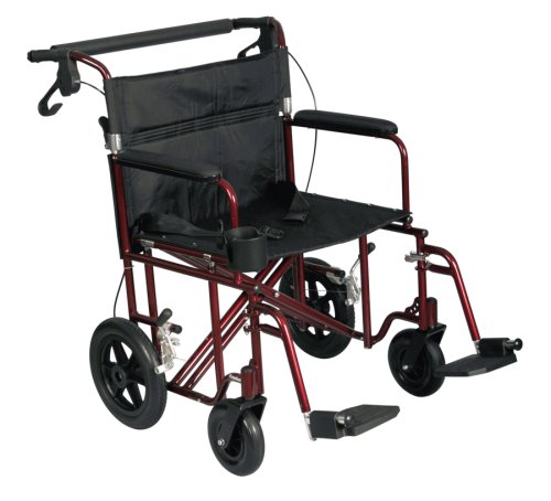 Ultralight Bariatric Transport Chair: With a 400 lb weight capacity this lightweight chair weighs only 33 lbs. An attachable push bar with foam grip makes it easy to push and it's easy to load into a car. Comes standard with a cup holder, accessory pocket, key ring, identification holder, iPod/billfold pocket. Optional carrying case with shoulder strap. Permanent full-length arms, swing-away detachable footrests, Red.